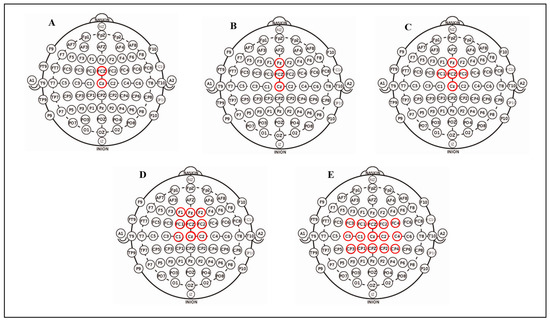 Visualization of the five channel groups chosen in the regions of anterior cingulate cortex. The five channel groups (A–E) illustrate the position of the 64 EEG electrodes on the scalp (small circles, each reporting the standard designation). The channels forming the channel group are highlighted in red.