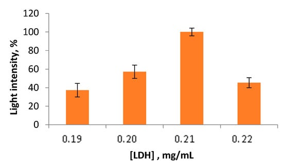 In the case of developing an enzyme-based-assay with a high sensitivity to lactate concentrations in saliva, one should investigate the effects of enzymes and substrate composition [15,23] on the activity of the multi-enzyme LDH + Red + Luc system. This activity is needed for the simultaneous operation of all the enzymes involved in the multi-enzyme system. As the activity of the bioluminescent coupled triple enzyme system depends on the LDH activity due to the fact that LDH is responsible, in this enzyme system, for the transition of NAD+ to NADH, at the first step the influence of the LDH concentrations of the activity of the multi-enzyme system was tested (Figure 1). The range of LDH concentrations was from 0.19 to 0.22 mg/mL. Based on Figure 1, the presence of 0.21 mg/mL of LDH in the reaction mixture caused the highest values of light intensity of the triple enzyme system. In contrast, when LDH was added to the reaction mixture at a concentration which was equal to 0.22 mg/mL, this action caused a massive reduction of the activity of the LDH + Red + Luc enzyme system. It seems that in the presence of 0.21 mg/mL of LDH in the reaction mixture, there appeared cooperative effects between the enzymes involved in the multi-enzyme system [19].