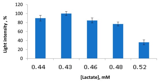 Lactate is one of the chemicals which plays a key role in the accuracy of the bioluminescent-based-multi-enzyme biosensor. Lactate was varied at concentrations ranging from 0.43 mM to 0.52 mM (Figure 2). It was shown that the lactate concentrations above 0.43 mM led to a monotonically decreasing activity of the LDH + Red + Luc enzyme system. The residual light intensity values of the multi-enzyme system were 80%, 75%, and 38% in the presence of 0.46 mM, 0.48 mM, and 0.52 mM lactate concentrations, respectively. This could be caused by substrate inhibition or altering the pH value of the reaction mixture in the presence of lactate at concentrations more than 0.44 mM. Meanwhile, the lactate concentrations that were equal to 0.43 mM and 0.44 mM had almost the same residual light intensity values. Thus, for the bioluminescent-enzyme-based bioassay, the 0.43 mM lactate concentration was chosen.