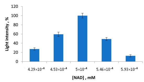 In the next step, the NAD+ concentrations were changed. The effect of the NAD+ concentrations in the range from 0.000429 M to 0.000593 M on the values of light intensities of the LHD + Red + Luc enzyme system was tested (Figure 3). According to Figure 3, adding the NAD+ concentrations from 42.9 mM to 50 mM to the reaction mixture leads to an increase in the residual light intensities of the multi-enzyme system. Additionally, the maximum light intensity of the LDH + Red + Luc enzyme system was recorded in the presence of 50 mM NAD+. The concentrations of NAD+, which were above 50 mM, caused the inhibition of the activity of the multi-enzyme system.