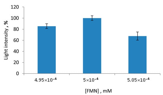 Another substrate of the applied multi-enzyme system is FNM; its concentration variation also was checked (Figure 4). The range of the FMN concentrations was from 49.5 mM to 50.5 mM. It was shown that the FMN concentration, which was equal to 50 mM, showed the highest light intensity values of the LDH + Red + Luc enzyme system. Other FMN concentrations did not match the high light intensity values nor had a negative impact on the activity of the multi-enzyme system.
