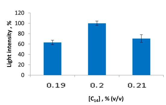 Tetradecanal (C14) is another substrate that could influence the sensitivity of the biological part of the lactate biosensor based on the multi-enzyme system. C14 was altered in the range from 0.19% (v/v) to 0.21% (v/v) (Figure 5). The obtained results showed that the optimal C14 concentration in the reaction mixture should be 0.20% (v/v). Other studied concentrations of C14 did not meet the expectations regarding the high activity of the LDH + Red + Luc enzyme system.