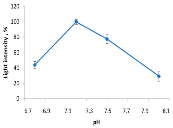 In the development of biological parts of the enzyme-based sensors, pH might be a significant factor resulting in the accuracy and sensitivity of the sensors to salivary lactate. The activity of the LDH + Red + Luc enzyme system was measured in the range of pH from 6.8 to 8.0 (Figure 6). These data are relevant for testing because the enzymes of the coupled triple bioluminescent system have their own pH optima. For instance, the pH optimum of the Red + Luc enzyme system is 6.8 [15]. But, the pH optimum of LDH for lactate formation is 9.0 [19]. Our results showed that the LDH + Red + Luc enzyme system had the optimal pH of 7.2. It seems that the Red + Luc enzyme system has a dominant position in the coupled enzyme system consisting of three enzymes. It is likely to be the case when the activity of the multi-enzyme system is measured based on the light intensity values. For this reason, the decrease in the light intensity values of the LDH + Red + Luc enzyme system at pH higher than 7.2 is connected with non-optimal pH conditions for the Red + Luc enzyme system catalysis rather than with other features of the reaction mixture.
