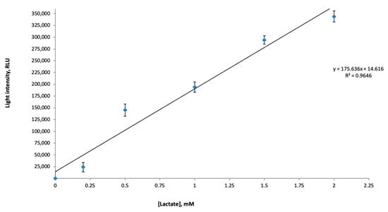 As is reported, the lactate concentrations in saliva are lower than in blood [22]. Meanwhile, the lactate content could vary among the people having regular training and those without it [8]. Previously, it was reported that the 0.2 mM concentration of salivary lactate was attributed to common and healthy people (non-athletes) [24]. The range of salivary lactate concentrations from 0.5 mM to 1.5 mM was attributed to a group practicing any sports activities [25]. Based on these data, we prepared model lactate concentrations in this range and recorded the light intensity values of the LDH + Red + Luc enzyme system in the presence of the model lactate concentrations from 0.25 mM to 2.0 m (Figure 7). The calibration curve generated after recording the light intensity values of the LDH + Red + Luc enzyme system in the presence of the model salivary lactate showed that the activity of the multi-enzyme system had good linearity in the range from 0.25 mM to 2.0 mM (r2 = 0.9646). Therefore, the recorded light intensity values could be compared with the exact salivary lactate concentration, in the range from 0.25 mM to 2.0 mM, in the case of making a conclusion regarding the training load monitoring. Thus, this linear dependence of the activity of the LDH + Red + Luc enzyme system on the lactate concentration suggests that the proposed bioluminescent-enzyme-based bioassay should have a sensitivity to salivary lactate.