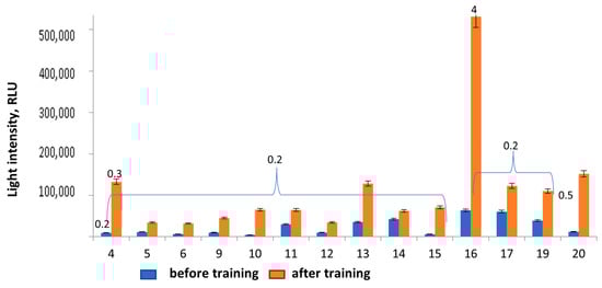 The impact of the saliva samples on the activity of the LDH + Red + Luc enzyme system is presented in Figure 8. As illustrated in this figure, the light intensity values of the multi-enzyme system in the presence of the saliva samples collected before the training load have average values of 35,000 ± 15,000 RLU. The activity values of the triple-enzyme system in the presence of the saliva samples collected after the training load are higher than before the training load. Additionally, the variation of the light intensity values of the LDH + Red + Luc enzyme system in the presence of the after-training-load saliva samples indicates that each student has an individual response to physical exertion.