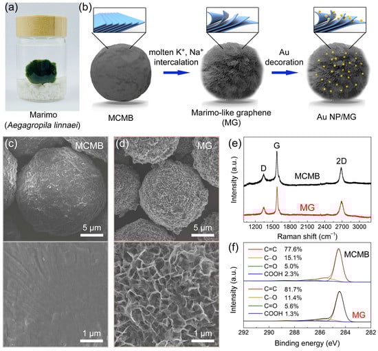 (a) Real photo of Marimo. (b) Schematic illustration of the fabrication of Marimo-like graphene (MG) and Au NP-decorated Marimo-like graphene (Au NP/MG). SEM images of (c) MCMB and (d) MG. (e) Raman spectra and (f) C1s XPS spectra of MCMB and MG.