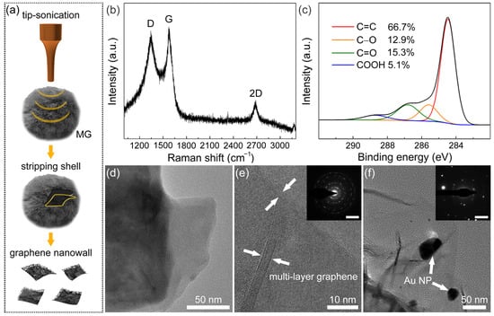 (a) Scheme of stripping and collecting graphene nanowalls shell from MG. (b) Raman spectrum and (c) C1s XPS spectrum of graphene nanowalls. (d) TEM image and (e) HRTEM image of MG (inset: SAED pattern; scale bar: 5 nm–1). (f) TEM image of Au NP/MG (inset: SAED pattern; scale bar: 5 nm–1).