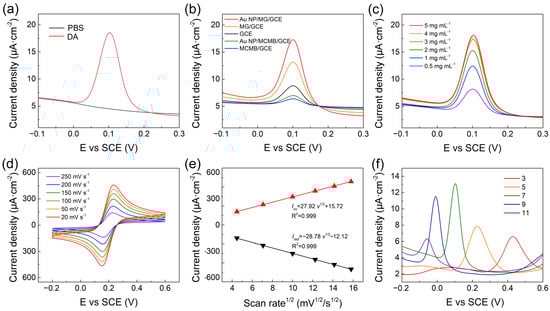 To explore the electrochemical performance of Au NP/MG/GCE towards DA, the DPV technique was conducted on the Au NP/MG/GCE electrodes in PBS with 10 μΜ DA. Compared to the curve from blank PBS, an oxidation peak at potential position 0.10 V appeared in the experimental group and specified as the characteristic peak for electrochemical analysis of DA, as shown in Figure 3a. As shown in Figure 3b, DPV curves of electrochemical behaviors at a potential interval of −0.1–0.3 V were performed in the presence of 10 μM DA on bare GCE, MCMB/GCE, Au NP/MCMB/GCE, MG/GCE, and Au NP/MG/GCE electrodes, respectively. The current intensities of MCMB/GCE and Au NP/MCMB/GCE electrodes were both lower than bare GCE, demonstrating the poor electrochemical activity and absorbability of MCMB towards DA. It is noticed that the current density is calculated from the geometric area of GCE. Compared to the MCMB/GCE electrodes, the current intensity of MG/GCE electrodes improved by ≈20%, indicating the much better electrochemical activity of MG than MCMB towards DA. It can be speculated that the specific surface area was greatly enhanced, and lots of edge defects as electrochemical active sites were exposed during the transition of MCMB to MG via molten alkali intercalation [56,62]. After hybridization with Au NPs, the electrochemical performance of Au NP/MG/GCE electrodes improved to the maximum, indicating that the electrodes with better electrical conductivity promoted the electron transfer of the DA oxidation reaction.