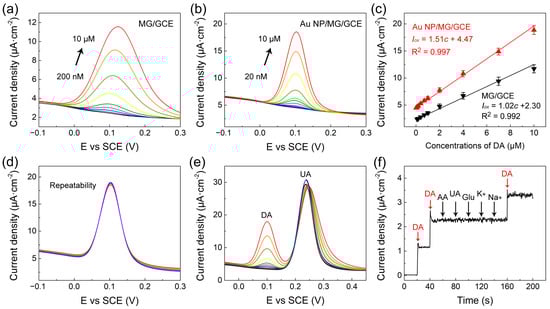 (a,b) DPV curves of MG/GCE and Au NP/MG/GCE electrodes with various concentrations of DA, respectively. (c) The corresponding peak current versus DA concentration. (d–f) The repeatability and good anti-interference of Au NP/MG/GCE electrodes.