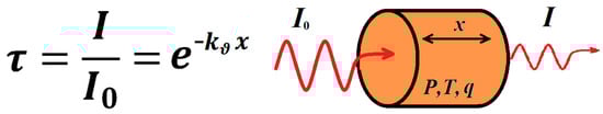 As mentioned in the introduction, the transmittance of specific wavelength of light traveling through a volume of gas is described by the Lambert–Beer law [2,14] and shown in Figure 1: