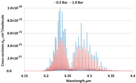 Figure 2 presents the simulation results of absorption cross sections, σϑ [15], for an environment with stable CO2 concentration and temperature, for two different values of pressure. As can be seen, there is a clear difference in the resultant absorption cross section due to the variation of pressure. According to Equation (1), a decrease in the absorption cross section results in an increase in the concentration reported by the sensor. This means that pressure variation in the sensing environment affects the optical transmission in two ways: