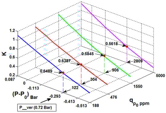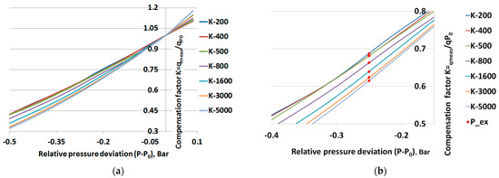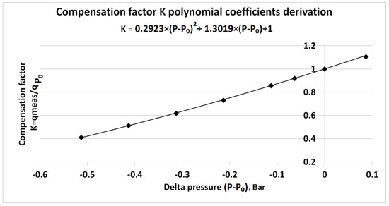 The data collected and calculated in the calibration points give the compensation factor K vs. delta pressure (P – P0). This could be described by polynomial Equation (4), which from Figure 3 results in: