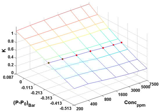 Figure 5 presents the values for the compensation factor as 3D surface in the investigated pressure and concentration range. Each reference concentration for a certain pressure level is matched with a set of K values (red dots).