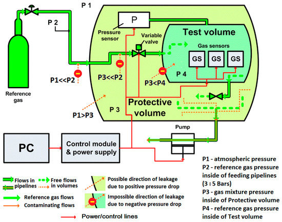 Schematic of the pressure calibration system. Protection against possible contamination from ambient concentration is based on a pressure drop. The pressure drop is developed by maintaining the pressure in the test volume higher than in the protection volume.