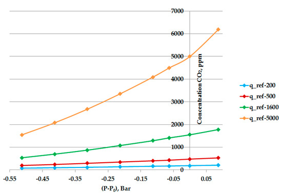 To evaluate the pressure compensation procedure, a calibration was performed based on six reference gases (200, 500, 800, 1600, 3000, and 5000 ppm CO2). Figure 7 presents the obtained data in four concentrations—200, 500, 1600, and 5000 ppm CO2, used for pressure calibration calculations. The data retrieved from reference concentration 800 and 3000 ppm was used for verification of the compensation procedures.