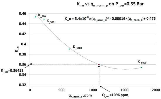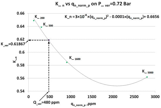 The dependence K_n vs. qn_norm_p contains a set of all possible compensation factors within calibrated range at the specific pressure (here P_ver = 0.72 Bar) where qmeas was obtained. The K_n dependence equation gives the value of the compensation (here K_ver) matching the respective reported qmeas (here Q_ver).