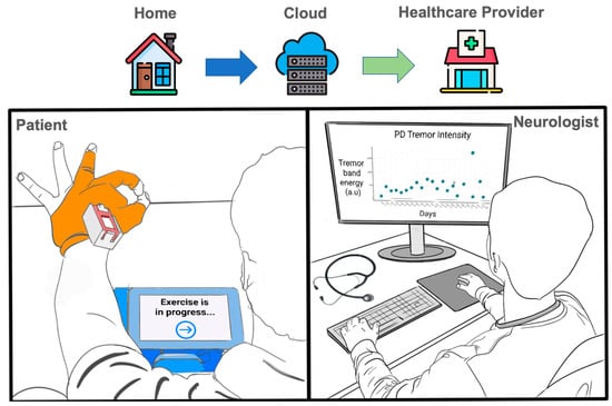 An overview of the iTex system (left). User performing movement exams while wearing iTex gloves at home. Clinician reviewing movement symptom analytics over a period from the clinic (right).