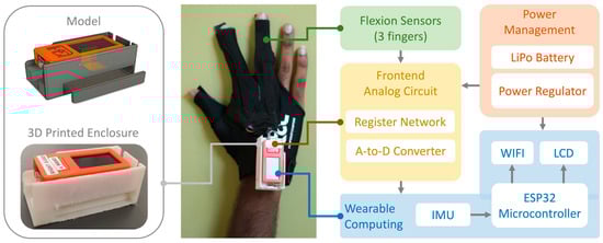 Specifically, we aimed to measure the movement of the index finger, middle finger, and thumb. To measure finger flexion, the 2″ polyamide-backed resistive flex sensor (Flexpoint) was used [18]. It was found to be appropriate for measuring fine changes in bend angle repeatably due to lower time-varying decay compared to other resistive flexion sensors [19]. Additionally, it provides minimal resistance to flexion and conforms easily to gloves. The position of the bend sensor in the index and middle finger was aligned such that the base of the sensor was over the knuckles as seen in Figure 2. For thumb movement sensing, positioning the sensor directly over the thumb provided minimal variation during finger tapping and closed grip exams. Based on this observation, the sensor was placed between the index finger and thumb to record movement associated with the same movement tasks. The sensors were interfaced directly to a pair of three-finger billiards gloves to improve usability for PwPD who have often had problems coordinating fine movement in their fingers. Figure 3 showcases the assembly process for the iTex glove prototypes. The M5stickc unit and the ADC PCB were housed with a 3D printed enclosure (58.5 × 24 × 28 mm) and weighed 15 g, seen using the FlexFill 98A filament which has characteristics of hard rubber providing impact protection and improves the robustness of the system.