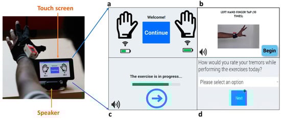 Patient-centered interface: (a) Welcome screen with battery status; (b) Audiovisual instruction for movement task; (c) Movement task timer with the prompt to end task upon early completion; (d) Daily symptom questionnaire.