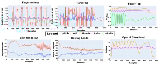 The data quality from the iTex gloves (Inertial: pitch, roll and Flexion: index, thumb, middle) as seen in Figure 6, show that the gloves can detect the fine movement tasks associated with the MDS-UPRDS-III. As seen in Figure 6 in the resting hands and holding both hands out sensor data plot, higher frequency components are present within later segments of the data. The plots also indicate that inertial signals (pitch, roll) capture movements associated with Finger to Nose, Hand Flip, Both Hands out, and Resting Hands. Meanwhile, flexion signals (index, thumb, middle) capture movements associated with Finger Tapping and Open and Close hand tasks. Additionally, the data indicate that the kinetic movement task (Finger Tapping) includes resting data since the user might complete the task earlier.