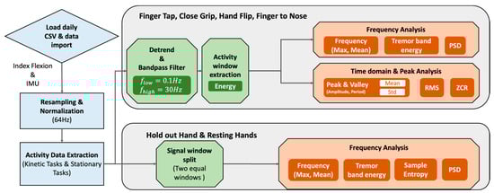 Signal Processing Pipeline: Figure 7 summarizes the signal processing steps of extracting time and frequency domain features for the different upper body movement tasks. The movement-related flexion and inertial sensing data from sensing gloves were extracted for pre- and post-medication intake for analysis. Essentially, sensor signals from flexion sensors and IMU were resampled at 64 Hz to make the data consistent for advanced processing and analysis. Later, each activity data were extracted from the raw signals.