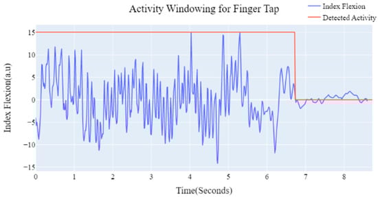 Adaptive Windowing: For proper analysis, it is important to extract and isolate the activity data before processing. To perform adaptive windowing of the kinetic movement task, we utilized a modified voice activity detector (VAC) concept to detect activity segments [25]. The VAC utilizes sliding window over the sensor data to compute energy within frames and sets adaptive thresholds based on mean energy and minimum energy. These windowed activity sensor data are processed within the signal pipeline based on the type of movement tasks (e.g., index flexion for Finger Tapping; inertial signals for Hand Flip, Finger to Nose, Resting Hands, and Hold Out Hand). Figure 8 shows the example of the activity detector for the finger tapping task; it indicates that the activity detector can segment and isolate sections with motion data.