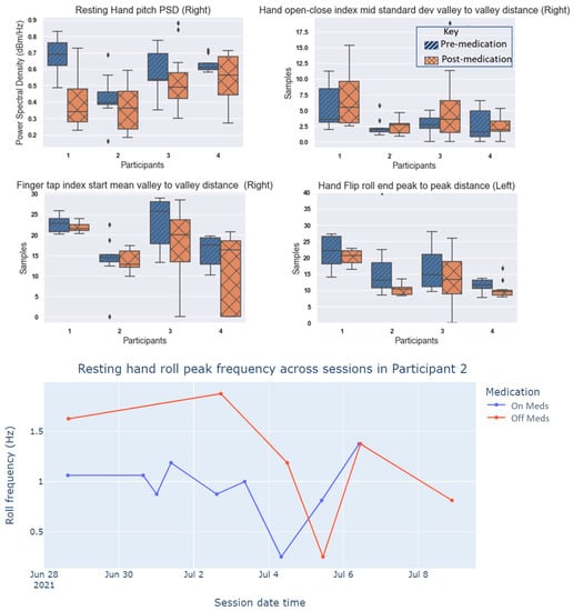 (Top) Box plot of features from iTex gloves across participants for pre- and post-medication states. (Bottom) Line chart showing resting hand roll peak frequency across sessions for Participant 2.
