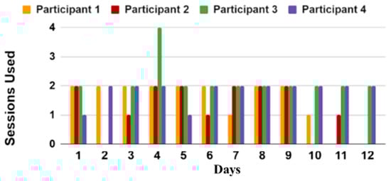 Participant Adherence: We investigated the participants’ adherence to using the iTex system as an indirect measure to understand the feasibility of this system. The adherence of participants using the iTex system was evaluated by analyzing the data logs and extracting the time and date for each session. The resultant sessions were grouped by day and visualized using a bar graph as seen in Figure 12. It was found that participants used the iTex system typically two times a day as instructed. There were certain days when participants did not use the system at all and days when they used the system only once. Participants 3 and 4 used the system most consistently, with Participant 3 using the system four times in one day. Participants 1 and 2 did not perform the test consistently in the last few days of the period.