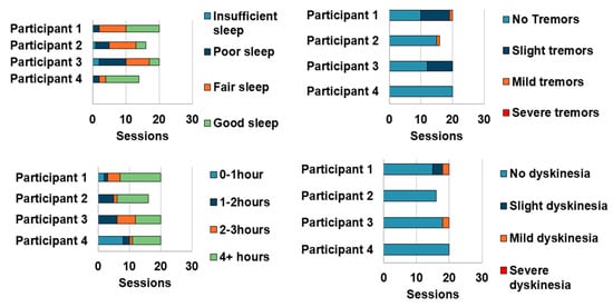 Bar graph representing self-reported measures obtained through daily questionnaire (top-left) sleep quality, (top-right) tremor symptom, (bottom-left) medication intake time, and (bottom-right) dyskinesia symptom.