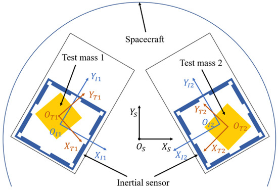 where and denote the position vector and the velocity vector of the test mass in IBF frame, respectively. and denote the attitude angle and the attitude angular velocity of test mass in IBF frame, respectively. is the position vector of the inertial senser center relative to the spacecraft mass center. is a rotational angle from SBF frame to IBF frame and it is a constant. is Earth’s gravitational constant. and are the distance of test mass and spacecraft from the Earth, respectively. and are the angular velocity and angular acceleration of the SBF frame relative to ECI frame.