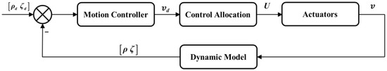 A control system with redundant actuators can usually be divided into two serial levels, which can be seen in Figure 3. Firstly, a motion control algorithm is designed as a high-level controller that takes reference signals () and system states as inputs and outputs the commanded forces and torques. Secondly, a control allocation algorithm is designed to map the commanded forces and torques to the redundant actuators. The mapping scheme is not unique, which enables secondary control objectives such as power minimization and fuel equalization to be achieved on the basis of satisfying the commanded forces and torques. Independent design of the motion control algorithm and control allocation algorithm greatly reduces the complexity of the control system. The motion control algorithm ensures the control performance such as the stability of the system, and the control allocation algorithm handles problems such as actuator saturation and failure.