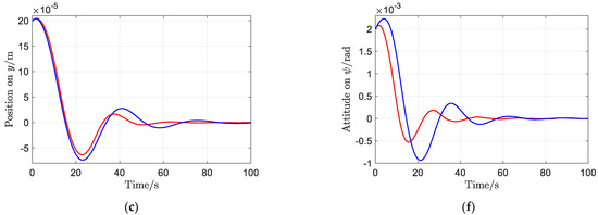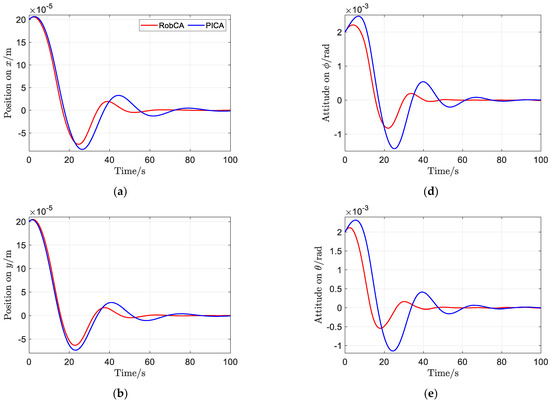 Figure 6 and Figure 7 show the time response comparisons of position and attitude, and velocity and angular velocity of the test mass under the aforementioned PD controller with the proposed RobCA method and the PICA method, respectively. It can be seen that under the RobCA method, the test mass reaches the commanded target with a settling time less than 50 s, while it is more than 90 s under the PICA method. Moreover, the oscillation amplitude of the states of the test mass under the RobCA method is also smaller than that of the PICA method. In addition, since the weight function of the RobCA method unifies the control forces and torques to the same scale, the position and attitude of the test mass reach the commanded target almost simultaneously.