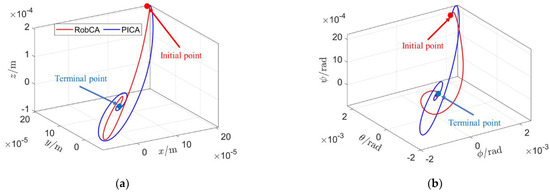 Trajectories of the position and attitude of the test mass with the RobCA method and the PICA method. (a) Position trajectories. (b) Attitude trajectories.