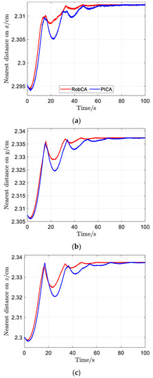 The nearest distance between the test mass and the electrode house with the RobCA method and the PICA method. (a) Nearest distance on x. (b) Nearest distance on y. (c) Nearest distance on z.