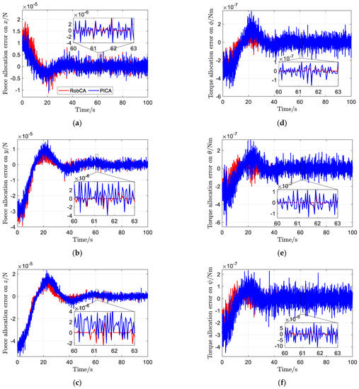 Define the error between the commanded forces and torques vd and actual electrostatic forces and torques after control allocation v as control allocation error, i.e., . The time response comparison of the control allocation error is shown in Figure 10. It is clear that the control allocation error of the RobCA method is less than that of the PICA method. The average norm of forces allocation error and torques allocation error with the RobCA method are 5.5 × 10−6 and 6.2 × 10−8, respectively, which are only 79% and 43% of that of the PICA method.