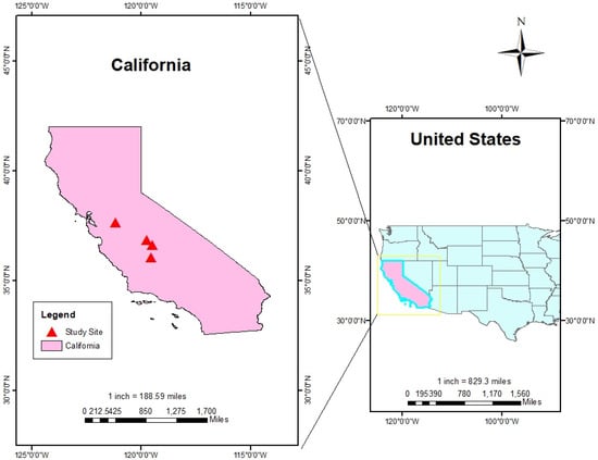The study focuses on four sites (see Figure 1) located in the Californian Central Valley, also known as the Great Valley. The Central Valley is a broad, elongated, flat valley that covers about 20,000 square miles, which corresponds to about 11% of California’s total land area. The diverse climates across California (highland, cool interior, desert, Mediterranean) allow for a wide range of agricultural goods to be grown throughout the state (more than 250 different crops). It is California’s most productive agricultural region and produces 25% of the Nation’s food, including 40% of the Nation’s vegetables, fruits, nuts, and other table foods. Historical droughts that affected this region resulted in severe economic and environmental impacts, which posed a critical challenge to the food production system [,,,,,].