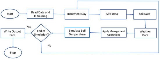 Epic version 1102 is used for all EPIC derived simulations in this study. We run EPIC at the four sites one at a time individually. The key process in the file structure of EPIC1102 is shown in Figure 2. The input data includes characteristics about soil, site (topography and geography data), and weather. For consistency with Noah-MP, the soil column is divided into four layers at the depth of 10 cm, 30 cm, 60 cm, and 100 cm. Daily weather information and monthly weather statistics were generated using the Weather Import and WXPM V3020 program available on the Texas A&M AgriLife website (https://epicapex.tamu.edu/software/weather-import accessed on 4 April 2022). Daily weather data are obtained from the California Irrigation Management Information System (CIMIS). CIMIS is a program unit in the California Department of Water Resources with 145 automated weather stations placed throughout California, mainly developed for farmers/irrigators for water resources management (https://cimis.water.ca.gov/Default.aspx accessed on 10 March 2022). Daily soil temperature is measured at a depth of 15 cm below ground with a soil thermistor. The accuracy of the sensor is within ±0.4 °C. Throughout the evaluation period between 2000 and 2019 across all sites, no frozen soil conditions (soil temperature < 273.15 K) were encountered, based on the CIMIS in-situ measurements.
