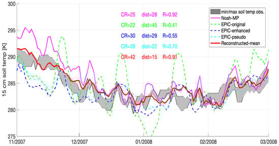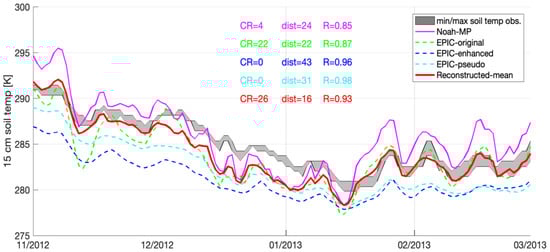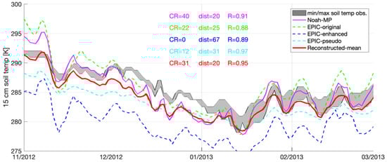 Therefore, to generate more reliable and stable soil temperature estimates, we derive a new set of estimates by fusing Noah-MP and EPIC simulations. Specifically, we compute the new reconstructed mean time series by taking the mean of the Noah-MP and EPIC-pseudo derived estimates. This, in general, yields the best and most stable performance, especially in terms of CR and dist. For example, at the Parlier station, the reconstructed mean series improves CR from 34.9 to 56.3, improves dist by from 28.88 to 16.99, and improves R slightly from 0.84 to 0.85 when compared to Noah-MP (i.e., the best single model simulation at this station). The relatively better results of the reconstructed mean series are likely, since Noah-MP yields a slight positive bias whereas EPIC-pseudo yields a negative bias. By taking the mean of both estimates, the reconstructed estimates could yield an overall best performance in terms of all goodness-of-fit statistics across all stations.