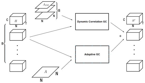 DGCM has a dynamic correlation graph convolution and an adaptive graph convolution that use adjacency matrices that DCM generated and adaptive adjacency matrix A, respectively. DGCM combines the result of the two operations so that the shape of the input and output stays the same.