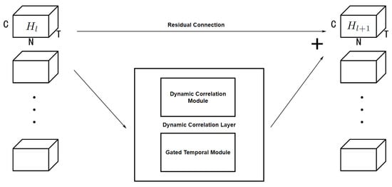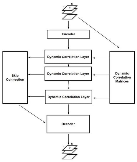 The whole model has an encoder–decoder structure. It has a dynamic correlation module to generate the adjacency matrices as shown in Figure 2, and a skip connection to prevent smoothing. The encoder and decoder are simple linear layers used to transform the shape of data. The hidden layers are several DCLayers, where each one contains a dynamic graph convolution module (DGCM, as shown in Figure 3), the difference between dynamic convolution and static convolution is shown in Figure 4. The DClayer also contains a gated temporal convolution module (GTCM, as shown in Figure 5), and the DClayer itself is shown in Figure 6. In addition, the whole structure is shown in Figure 7.