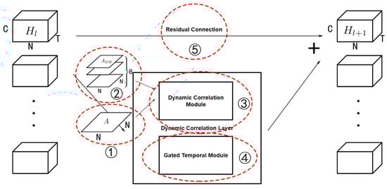 Since it is generated using input data X, is sample-variant, which can be called a dynamic correlation adjacency matrix. The generated progress is in the dynamic correlation module (DCM) as shown in Figure 2.
