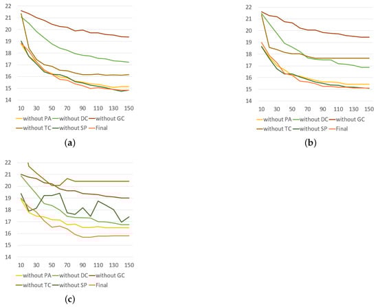 More details of the results of the above models are shown in Figure 9. (1) The curves of the model without PA are similar to the final model, which shows that the DCGCN can achieve a certain effect without a predefined adjacency matrix. In comparison, the model without DC only use a predefined matrix, which limits the spatial dependencies to have inferior results. (2) Both models without GC or TC cannot have good results, but their curves are very different due to the different circumstances of under-smoothing and over-smoothing. The former’s curves are gentle and slow to converge whereas the latter’s curves are fast to converge in training loss and validation loss but unstable in test MAE. (3) The model without SP is severely over-smooth; thus, its curve in test MAE becomes unstable after only 30 epochs, which shows that special connections are crucial as well.