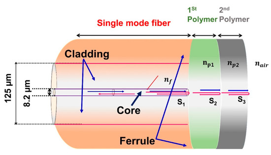 Figure 1 shows a schematic representation of the ferrule connector fiber-head based on double-polymer layers. DPFPI sensors employ the basic principle of Fresnel reflection, which is an optical phenomenon that occurs when two media with various refractive indices (RIs) come into contact [16,27,28]. In Figure 1, the SMF has the RI nf = 1.456, where np1 is the RI of the first polymer and np2 is the RI of the second polymer coated on the ferrule connector tip of the SMF. The proposed DPFPI sensors have three reflection surfaces: S1 is the first surface (SMF/polymer1st), S2 is the second surface (polymer 1st/polymer 2nd), and the 3rd surface is S3 (polymer 2nd/air), respectively. The Fresnel reflection coefficients for the three reflection surfaces above are R1, R2, and R3, respectively. The three reflected light beams interfere with each other when they return to the SMF because of their distinct optical trajectories. The corresponding reflected light intensities are denoted as S1, S2, and S3, respectively. T1 and T2 are the relative coating thicknesses of the first and second polymers, respectively. The resultant intensity of the reflected light, determined by the multibeam interference principle, can be stated as follows: