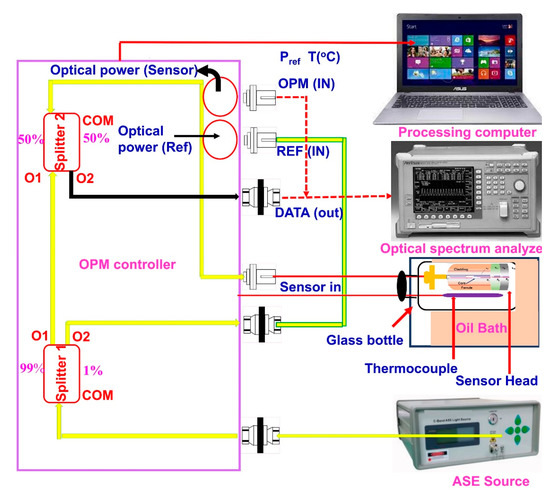 The temperature response of the fabricated sensor was investigated using the experimental setup shown in Figure 3. The light wavelength emitted by the C-band-amplified spontaneous emission (ASE) broadband source (ASE-BT-C-16-AF) is 1550 nm, which is coupled with the fabricated DPFPI through two coupler optical power controllers (OPCs). The reflection spectra were recorded using an optical spectrum analyzer (OSA) (Anritsu, Kanagawa Prefecture, MA9710C, Japan).
