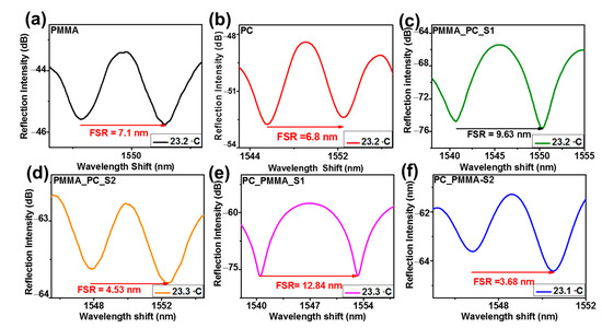 The coating images of the fabricated sensors were confirmed with optical microscopic images by using INC Microscopes (MIC S16C) (Winona Ave, St. Louis, MI, USA). Figure 4a displays a microscopic view of the standard uncoated SMF, where the ferrule connector tip is clean, spotless, flat, and uniform. A microscopic interpretation of the PMMA and PC SPFPI sensors is illustrated in Figure 4b,c. The coating thickness of the PMMA/PC polymer on the SMF was thin, even, and without air bubbles. The microscopic views of the PMMA_PC-S1, PMMA_PC_S2, PC_PMMA_S1, and PC_PMMA_S2 sensors are shown in Figure 4d–g, respectively. Figure 4d–g prove that DPFPI sensors form thin, clean, flat, and even without bubble coating. Therefore, all microscopic views imply that the adhesive properties of both the polymer with fiber and the polymer with the other polymer are effective in preparing an excellent sensor. If the sensor had irregular, abrasive, and air-bubble-filled coatings, it would reveal undesired reflective spectra [16,20,21]. According to the microscopic view of all the fabricated sensors, they were qualified for temperature sensitivity measurements. The reflected interference patterns of the fabricated sensors were examined at room temperature (Figure 5) to analyze the optical properties of the sensors. The spectra of the reflected beam of the invented sensors (PMMA, PC, PMMA_PC-S1, PMMA_PC_S2, PC_PMMA_S1, and PC_PMMA_S2) are illustrated with 7.1, 6.8, 9.6, 4.5, 12.8, and 6.7 nm free spectral ranges (FSRs) in Figure 5a–f, respectively, at a temperature range of 23.2–23.3 °C. By observing and comparing the spectral response with the microscopic view of the fabricated sensors, the sensors with thick microcavities displayed compact reflected interference spectra, while the compact microcavity sensors reflected rarer interference spectra. Reflected patterns were built based on distinct aspects, such as the method of fabrication, shape, and nature of the coating, RI, and thickness of the microcavity. The reflectivity at each interface and the nature of the polymer coating layer strongly affect the visibility of the resultant reflected interference patterns. The developed PMMA_PC_S2 and PC_PMMA_S2 sensors demonstrate a convex shape in the coating layer (Figure 4e,g) owing to the surface tension of the polymer solution and ferrule connector. As a result, the reflectivity at the polymer air surface is reduced, and the visibility of the resultant spectra was low compared to that with a flat coating layer. The PC_PMMA sensors revealed a good spectral response, implying excellent quality in the interpretation of the intensity of the three reflected interference beams. The three-beam interference pattern that appeared in the PC_PMMA sensors had a stronger reflection intensity at the SMF/PC and PC/PMMA interfaces than that of the PMMA_PC sensor, which could be because the RI difference is higher at interfaces created by the PC_PMMA-type sensor and the thickness of coating. This is also supported by Equations (1) and (4).