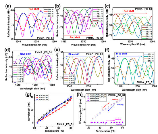 Reflected spectra with increase in temperature (a–c), with decrease in temperature (d–f), wavelength shift for three measurements (g), and (h) average wavelength shift associated with SMF for PMMA_PC_S1 DPFPI.