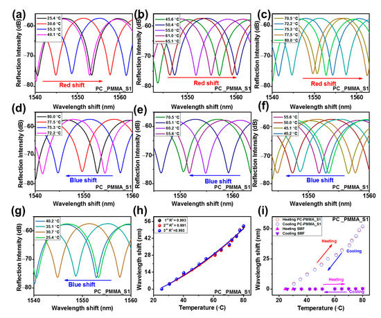 Reflected spectra with increases in temperature (a–c), decreases in temperature (d–g), wavelength shift for three measurements (h), and (i) average wavelength shift associated with SMF for PC_PMMA_S1 DPFPI.