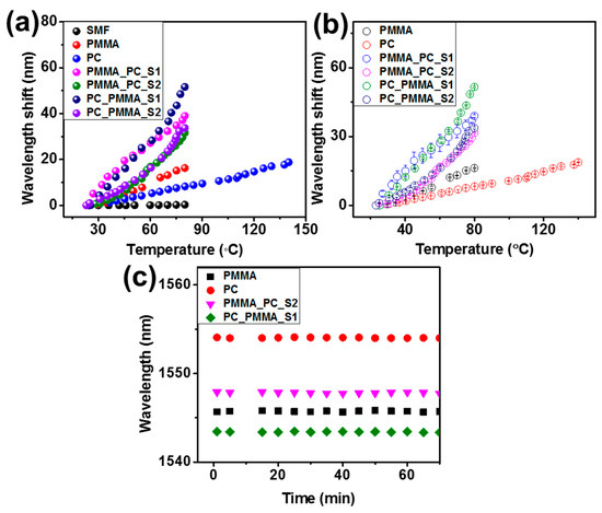 Figure 9b shows the comparison data of the average wavelength shift, along with their standard error bars. The results indicate that all sensors show precise measurements with good repeatability and feasibility. Specifically, the DPFPI sensors exhibited excellent sensitivity at a high temperature range (~70–80 °C); the results were 1558.9, 902.4, 1820.4, and 1262.6 pm °C−1 for PMMA_PC-S1, PMMA_PC_S2, PC_PMMA_S1, and PC_PMMA_S2 sensors, respectively. Finally, the temperature sensors were evaluated to check their stability at a constant temperature (~23.1 °C), and the reflection spectra as a function of time were obtained. The results are presented in Figure 9c and Figure S5, where the standard deviations are 0.0297, 0.023, 0.28, 0.263, 0.076, and 0.079 °C for the PMMA-SPFPI, PC-SPFPI, PMMA_PC-S1, PMMA_PC_S2, PC_PMMA_S1, and PC_PMMA_S2 DPFPI sensors, respectively. The standard deviations in the wavelength shift were 0.73, 0.01, 0.029, 0.057, 0.042, and 0.055 for the PMMA-SPFPI, PC-SPFPI, PMMA_PC-S1, PMMA_PC_S2, PC_PMMA_S1, and PC_PMMA_S2 DPFPI sensors, respectively, indicating great immovability. In addition, the DPFPIS sensor shows a very fast response (within 5–7 s) to the small temperature change (0.3–0.6 °C).