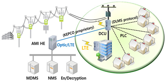 Figure 1 depicts KEPCO’s AMI architecture. KEPCO, the only one utility company in Korea, selects a data concentrator unit (DCU) type to provide an aggregator role as well as a protocol conversion feature, similar to other utility companies with AMI deployment [5,7,8,28]. Private optic communication and the IEC 12139-1 (high-speed power line communication) standard [29] are mainly used accordingly in DCUs as a back-haul and neighborhood area network. The DCU is installed near the distribution service transformer.