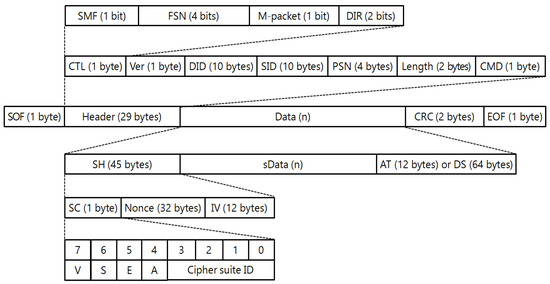 The structure of a packet consists of the start of frame (SOF), header, data, cyclic redundancy check (CRC), and end of frame (EOF) fields. The header field consists of control (CTL), destination ID (DID), source ID (SID), and command (CMD). It is distinguished by the request and response on remote metering depending on the direction (DIR) of the control field. The data field consists of a security header (SH) for cyber security requirements and its corresponding authentication tag (AT) or digital signature (DS) field. In addition, the security header consists of the security control (SC), nonce, and initial vector (IV) fields. It designates the cipher suite ID, digital signature generation (S) and verification (V), encryption (E), and authentication (A) using the security control field. Lastly, the metering information is defined in the data field with an array structure of meter ID, meter type, measurement type, and measurement values in order.
